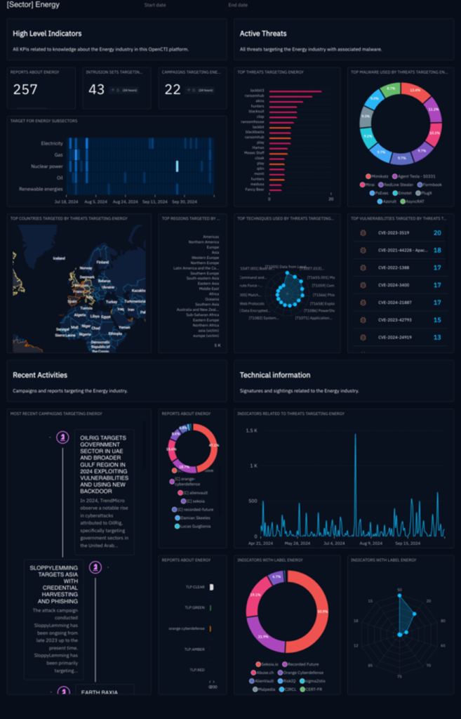 OpenCTIは、業種や地域を問わず、あらゆる脅威インテリジェンスに対して価値を発揮します。セキュリティレポートやダッシュボードに示される重要指標では、最新の動向を組織のコンテキスト(業界、所在地、サプライチェーンなど)に照らして注視できます。そのため、インシデント計画も組織に合わせて調整でき、最も関連性の高い脅威に備えることができます。
