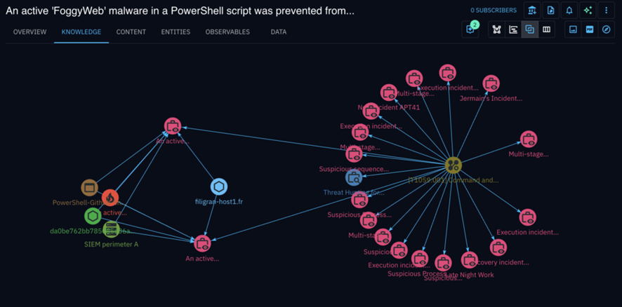 このビューでは、当該インシデントと他の類似インシデントとの関連性を表示します。下の図では、「filigran-host1.fr」というホストが同じエンティティに関わる2件のインシデントに関与していたことが確認できます。
