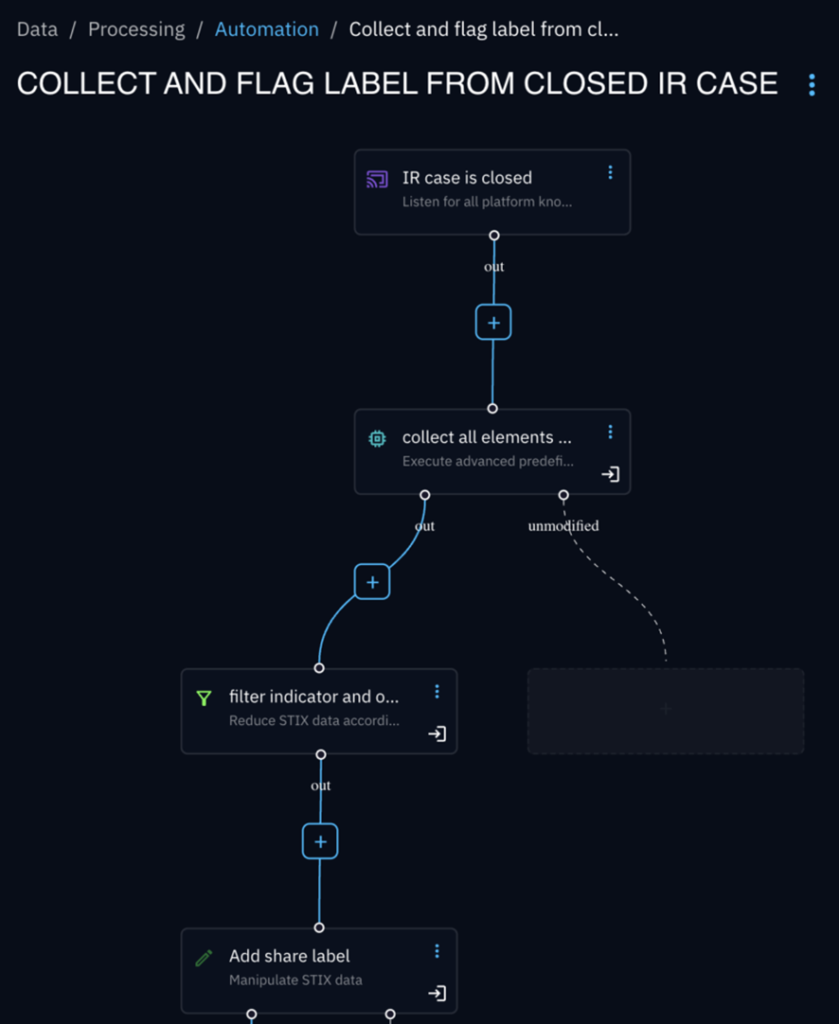 また、特定されたインジケーターを将来の利用に備えて保管すること、また共同サイバー防御実現のために関連部署・組織と共有することを忘れないようにしましょう。いずれも、インジケーターや観測内容を手動で選択し、専用のフラグでラベル付けすることで実現できます。また、インシデント対応ケースが「完了」になっていると、この操作を自動化するプレイブックを使って自動化することも可能です。