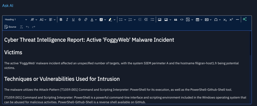 報告と公表は、退屈な作業と思われがちですが、OpenCTIの視点でインシデントを要約するAsk AIをうまく使うことで効率化できます。ただし、こうして作成した要約は、OpenCTIでは得られない追加情報や、インシデント対応者自身の見解やコメント等で補足する必要があります。