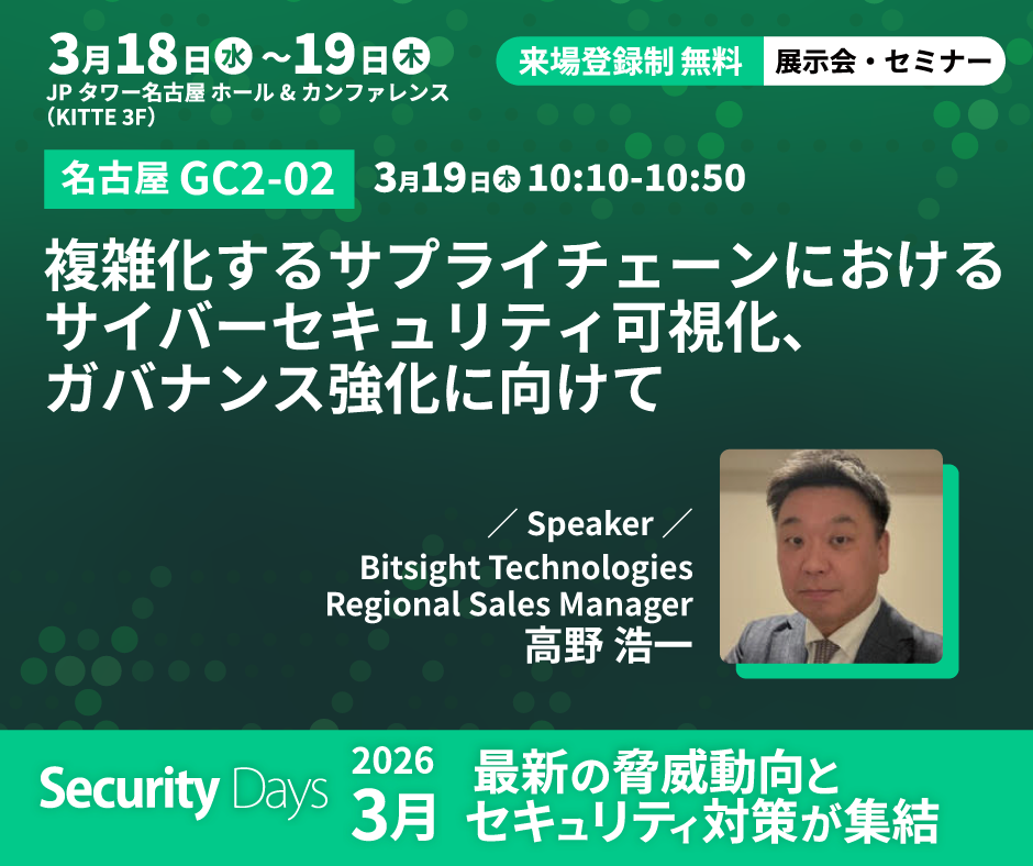 2026年3月18日(水)~19日(木)に開催される「Security Days Spring 名古屋」および「Security Days – Automotive Spring」に出展し、サイバーリスク評価のリーディングソリューション「Bitsight」をご紹介いたします。